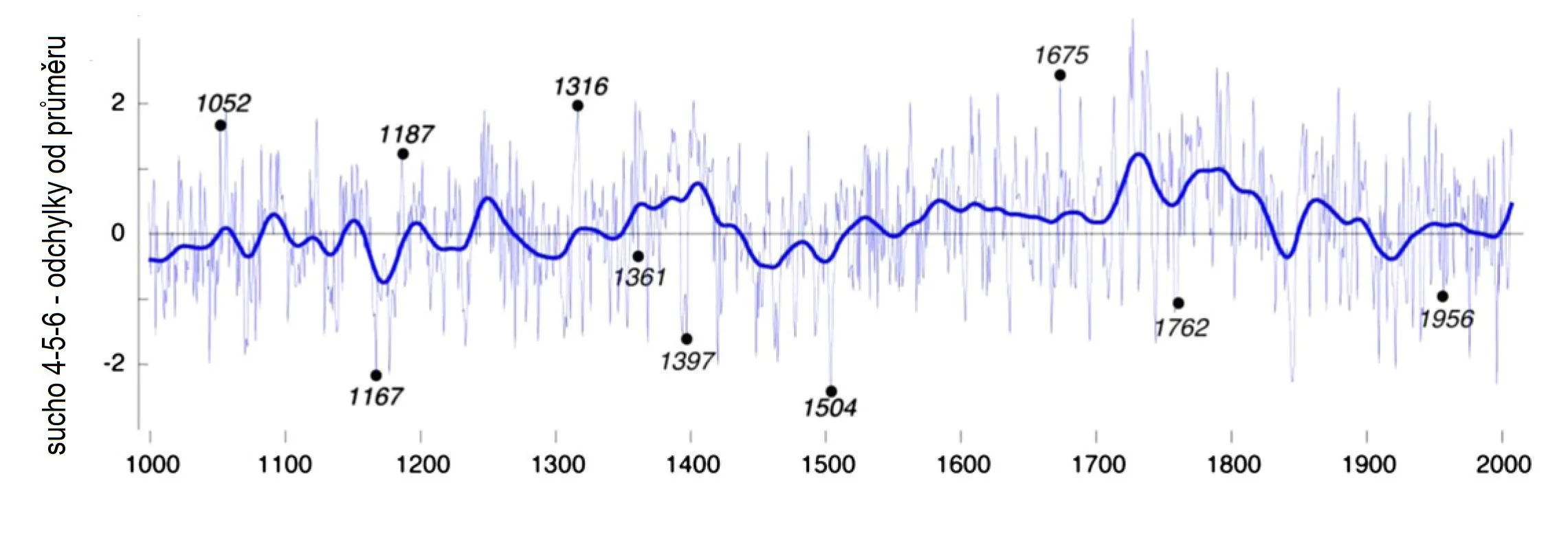Zájem o rekonstrukci sucha (definováno indexem PDSI) rozšířený na celou střední Evropu vedl k podstatnému rozšíření plochy zdrojů dat a rovněž kolektivu autorů. Předpokládaný nárůst antropogenních emisí skleníkových plynů a související dopady na klimatický systém Země pravděpodobně znamenají častější a závažnější extrémy počasí se změnami hydroklimatických parametrů. Hodnocení změn je však omezeno příliš krátkou dobou pokrytou meteorologickým měřením. Tento nedostatek řeší využití letokruhových chronologií jako dalšího zdroje dat. Práce představuje a analyzuje 11 873 letokruhových řad jedle z území ČR, Francie, Švýcarska a Německa, které nepřerušeně pokrývají období let 962 až 2007. Všechny extrémní šířky letokruhů byly evidentně vyvolány anomálními variacemi ve srážkách duben až červen. Dokumentární zdroje dendro-signál za poslední tisíciletí nezávisle potvrzují.
